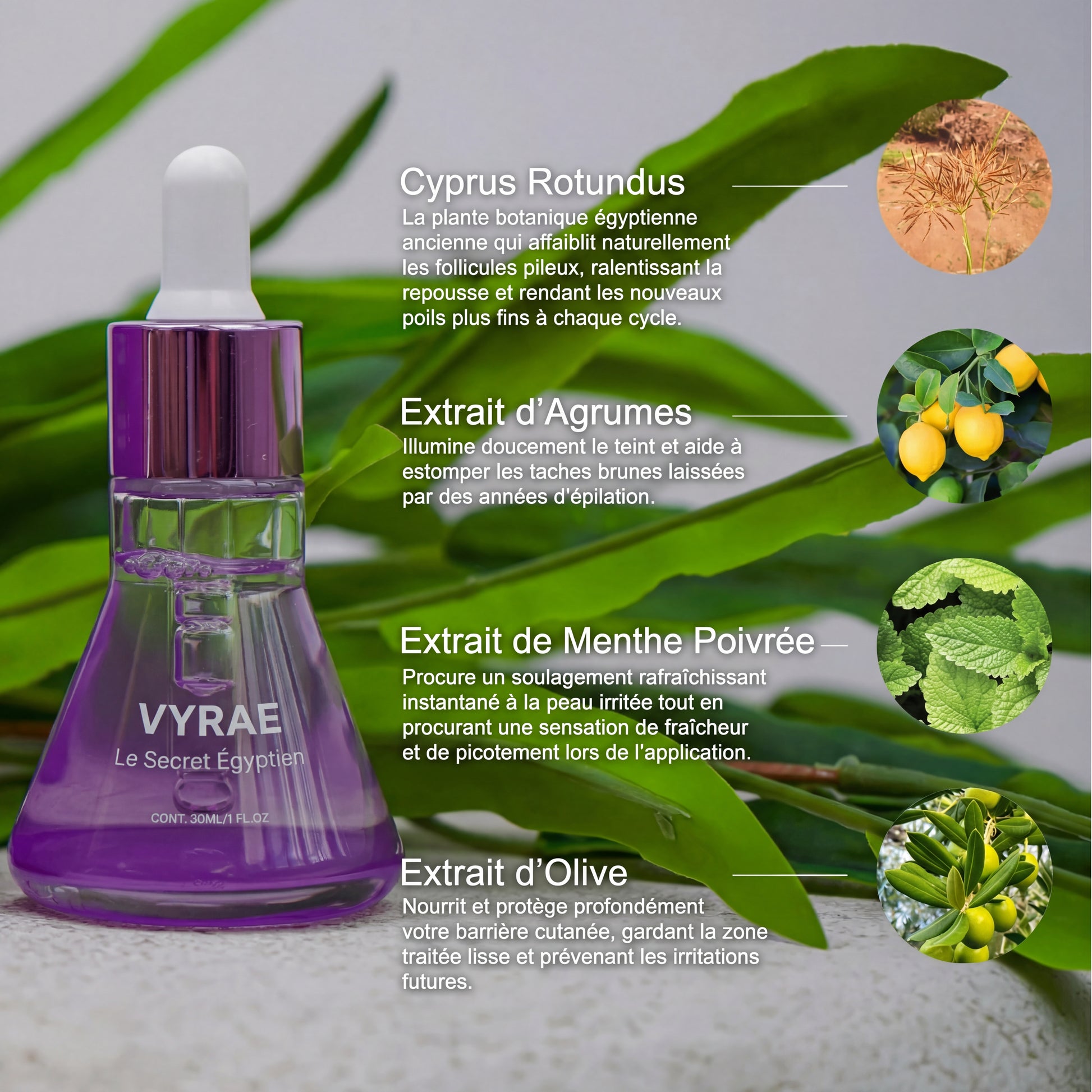 Quand tu t’épiles (cire, pince, rasoir, dermaplaning…), tu enlèves le poil, mais la “racine” (le follicule) reste sous la peau. Notre sérum Vyrae aide à mettre ce follicule en mode “pause” là où tu l’appliques. Résultat : la repousse est plus lentement, plus fins, jusqu'à ne plus jamais revenir.